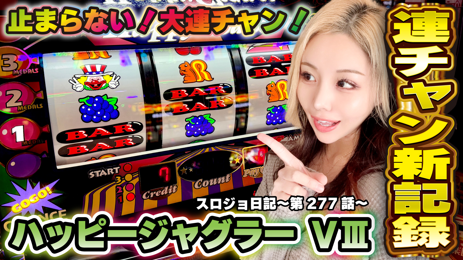朝一から「ハッピージャグラーV3」を実戦! 最高設定の可能性大! 最大の連チャン記録! プレミアの全消灯、先ガ ・・・