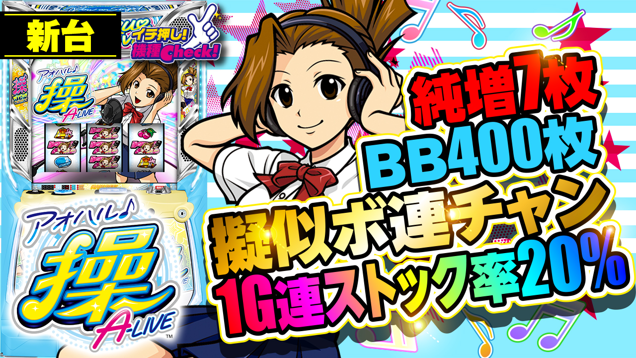2024年6月3日(火)~導入。 新台「アオハル♪操 A-LIVE」最新台! BB平均400枚獲得の擬似ボーナ ・・・