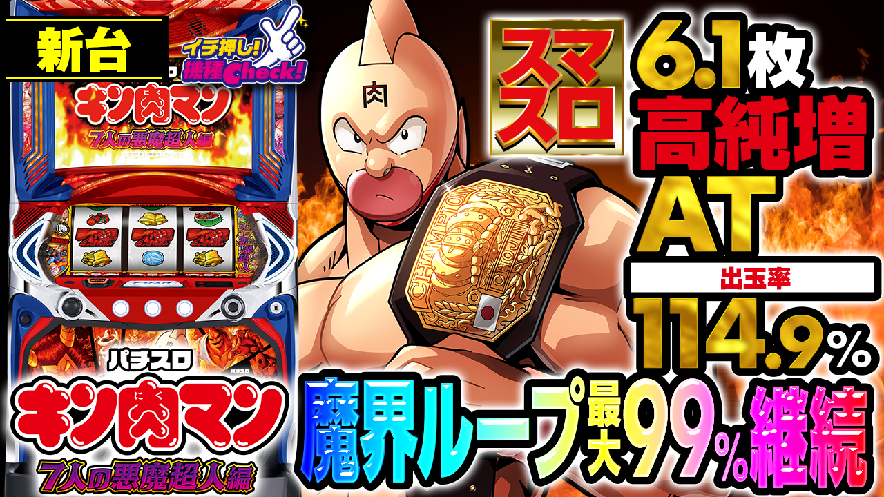 2023年8月7日(月)~導入。 パチスロ新台「スマスロキン肉マン~7人の悪魔超人編~」最新台! 高純増6.1 ・・・