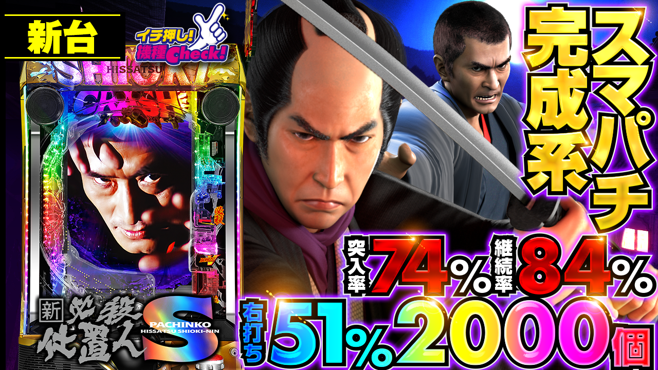 2023年4月24日(月)~導入。 パチンコ新台「新・必殺仕置人S」最新台! 継続率84%、大当り時の51%で ・・・