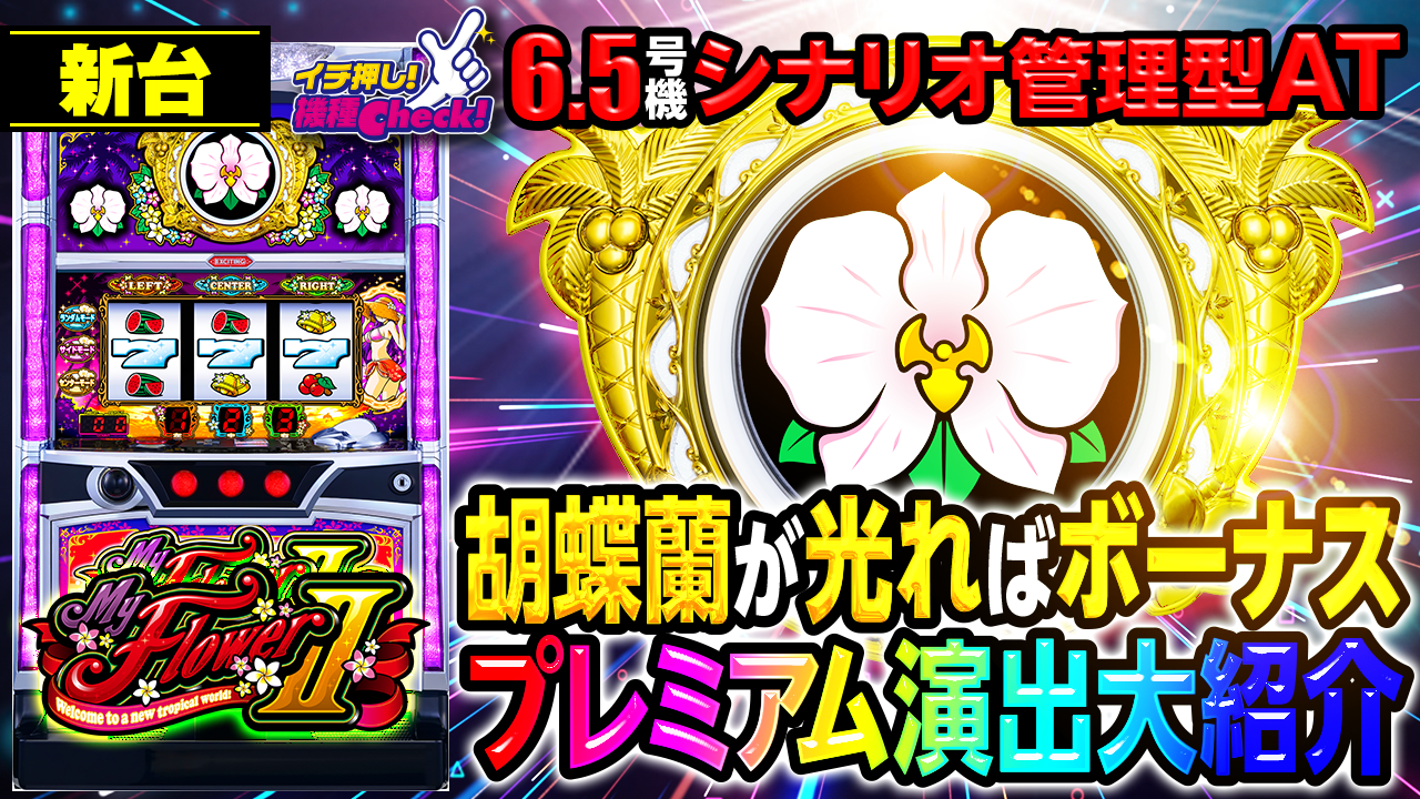 2023年5月8日(月)~導入予定。 スロット新台「マイフラワー2-30」最新台! 胡蝶蘭ランプが点灯すればボ ・・・
