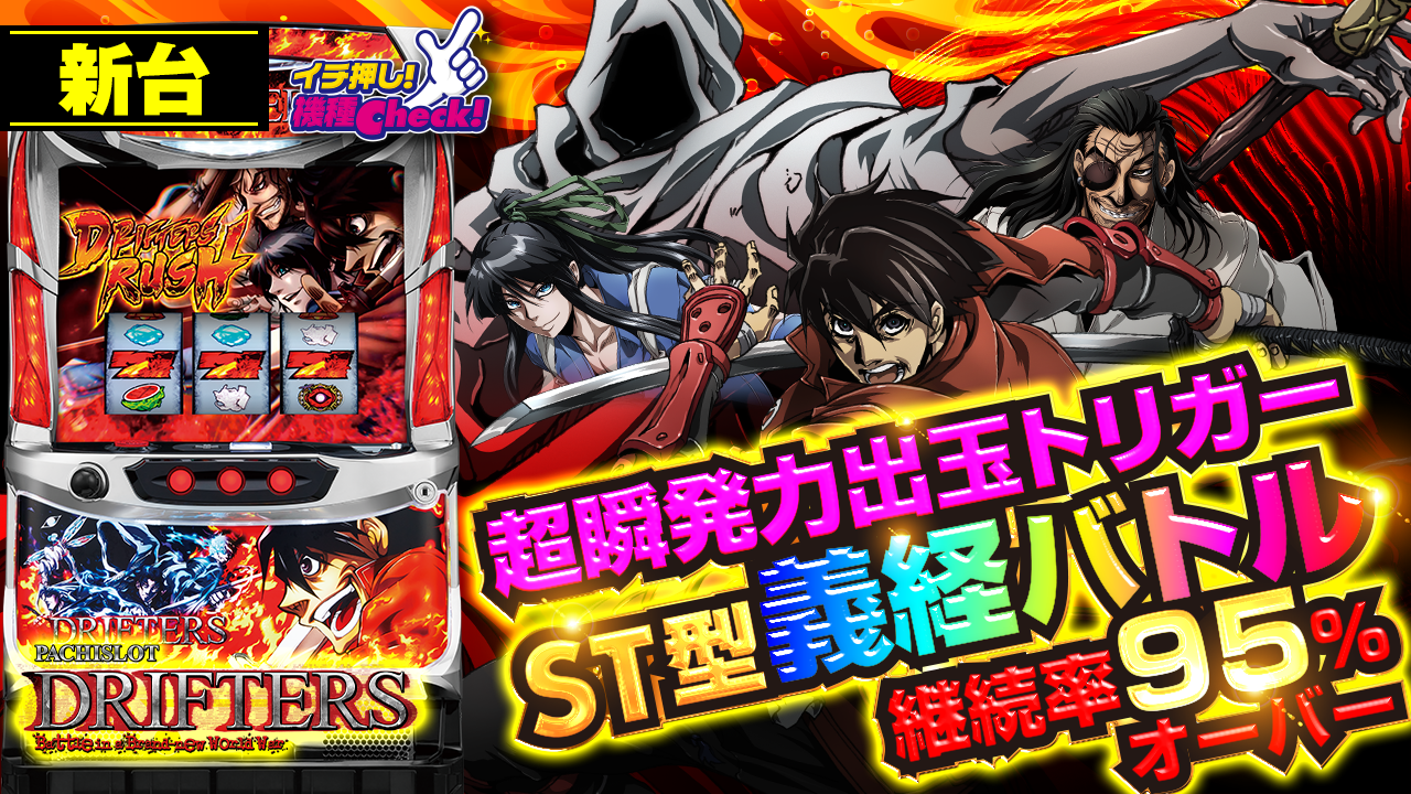 2022年2月7日(月)~導入予定。 パチスロ6.2号機「ドリフターズ」最新台! プレミアム義経バトル継続率9 ・・・
