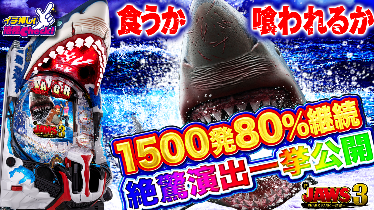 「ジョーズ」シリーズ最新台! インパクト抜群! サメの吐息を感じられるジョーズ筐体! 1500発が80%継続す ・・・
