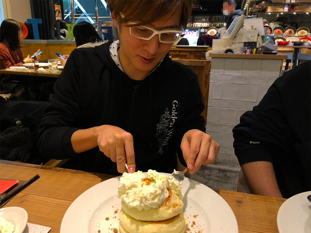 ちょっと時間が経つと自重で押しつぶされるくらいにふわふわなパンケーキは、甘さ控えめでシロップやホイップと合わせる事で上品な甘さに仕上がります。ホイップはそのままでも食べられるくらいすっきりとした甘さなので、頭の痛くなるようなくどい甘さとは対極な品のある甘さです。見た目のインパクトとは裏腹にペロッと食べられちゃう軽さです。