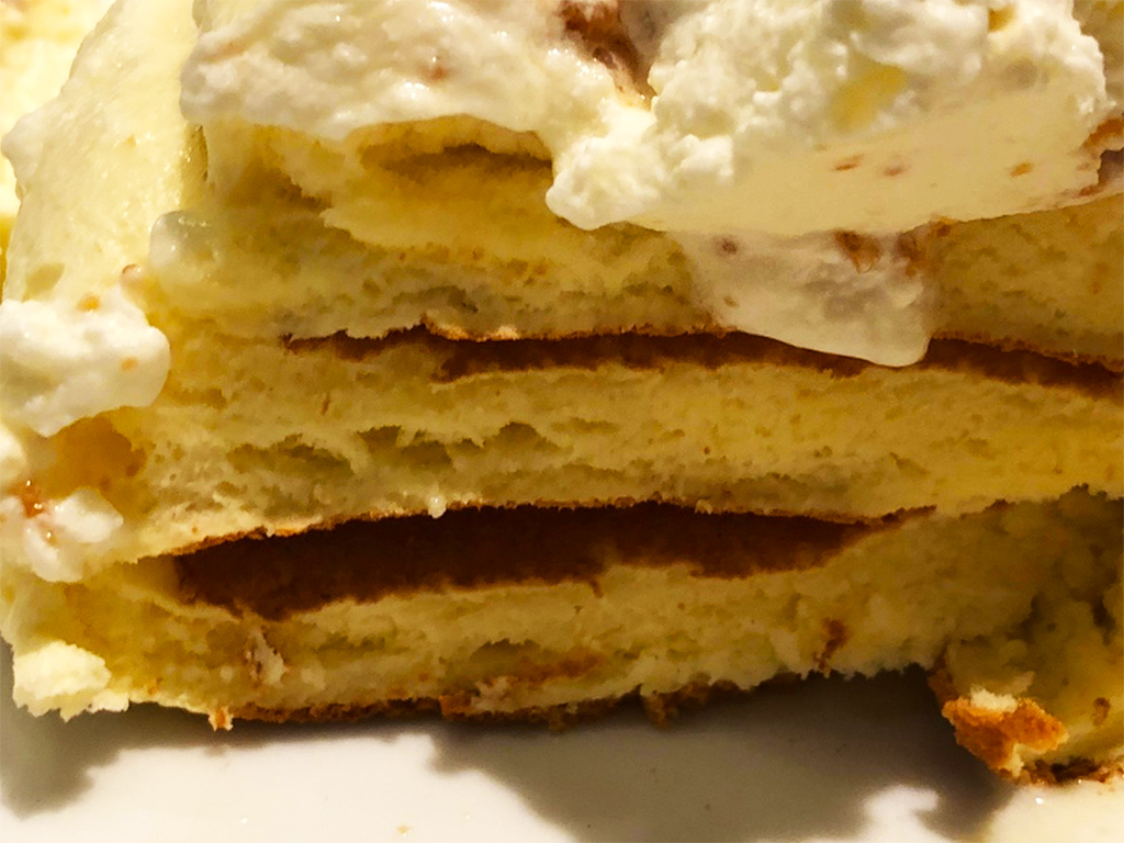 - フレンチトーストと並んで人気のふわふわパンケーキからは一番シンプルなやつをオーダー。厚めのパンケーキが3枚重なったところにたっぷりのホイップが乗っております。追加のホイップを頼んで「映え」狙いをしましたが、高過ぎると倒れるとの事でホイップは別皿でのご案内となりました(悲)。